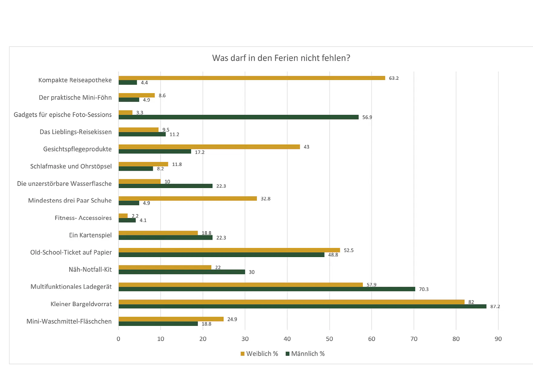Eindeutig Bargeld aber auch das Old-School-Ticket auf Papier – Männer und Frauen sind sich einig, dass es unverzichtbar ist. Auch ein Kartenspiel für gesellige Abende schafft es bei beiden Geschlechtern weit nach oben. Fitness-Accessoires? Eher nicht.